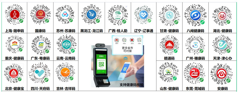 國家通用碼-國康碼、廣東-粵康碼、四川-天府通、江蘇-蘇康碼、內蒙-內蒙碼、上海-隨申碼、湖北-湖北碼、安徽-安徽碼、福建-八閩碼、河北健康碼、云南-云南碼、湖南-湖南碼,更多省市可對接。