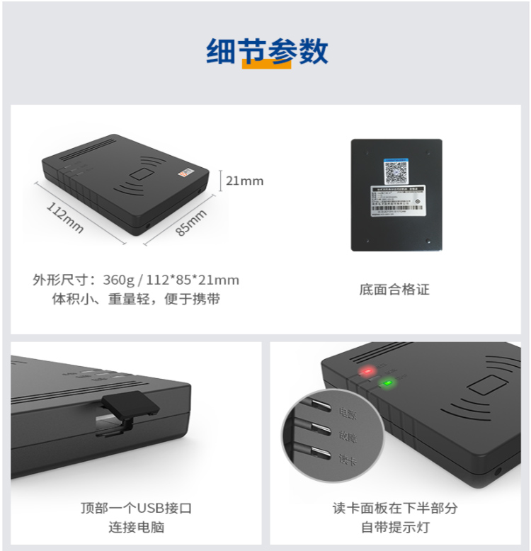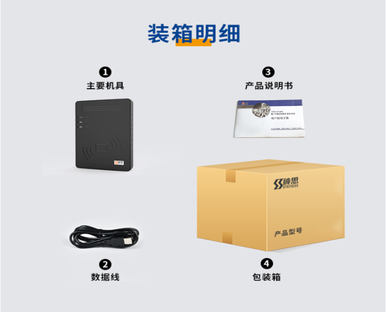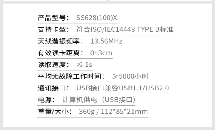 (*由于產品升級或其他原因,神思SS628-100X身份證閱讀器產品實際參數有可能變更,以實際產品為準。本文中的所有陳述、信息和建議也不構成任何明示或暗示的擔保)