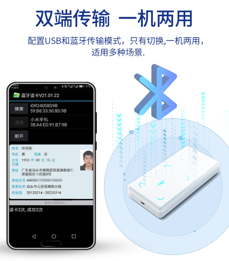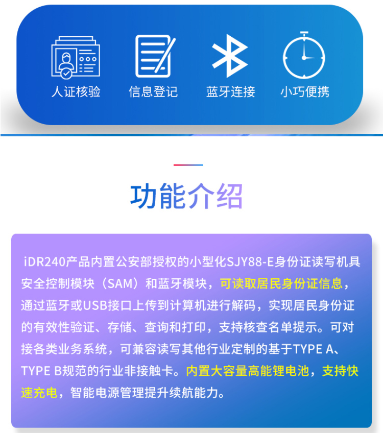 精倫Idr240產(chǎn)品是一款多功能射頻卡讀卡器,支持藍(lán)牙,有線雙端接入。產(chǎn)品內(nèi)置公安部授權(quán)的身份證讀寫機(jī)具安全控制模塊(SAM)和藍(lán)牙模塊,可讀取居民身份證信息,通過藍(lán)牙或USB接口上床到計(jì)算機(jī)進(jìn)行解碼,實(shí)現(xiàn)居民身份證有效性驗(yàn)證,查詢和打印,支持核查名單提示。可對接各類業(yè)務(wù)系統(tǒng),可兼容讀寫基于TypeA,TypeB規(guī)范的行業(yè)非接觸卡。內(nèi)置大容量高能鋰電池,支持快速充電,只能電源管理提升續(xù)航能力。